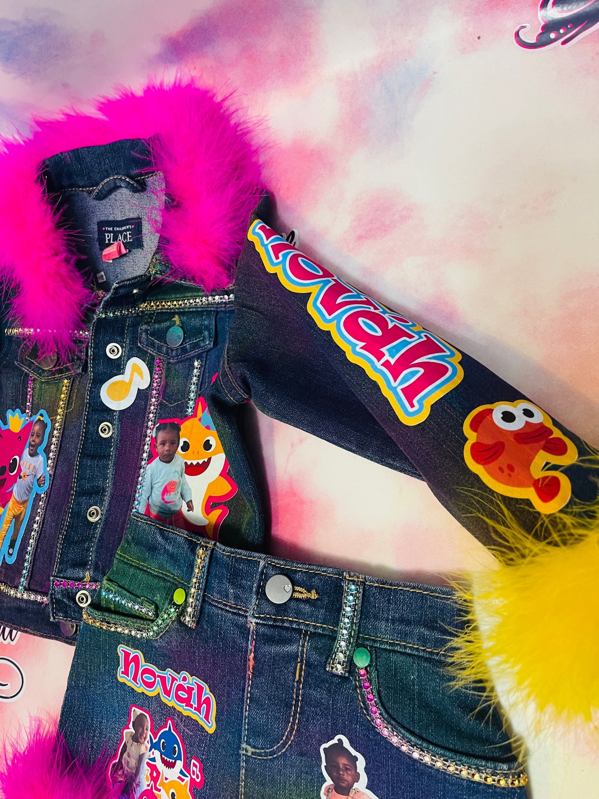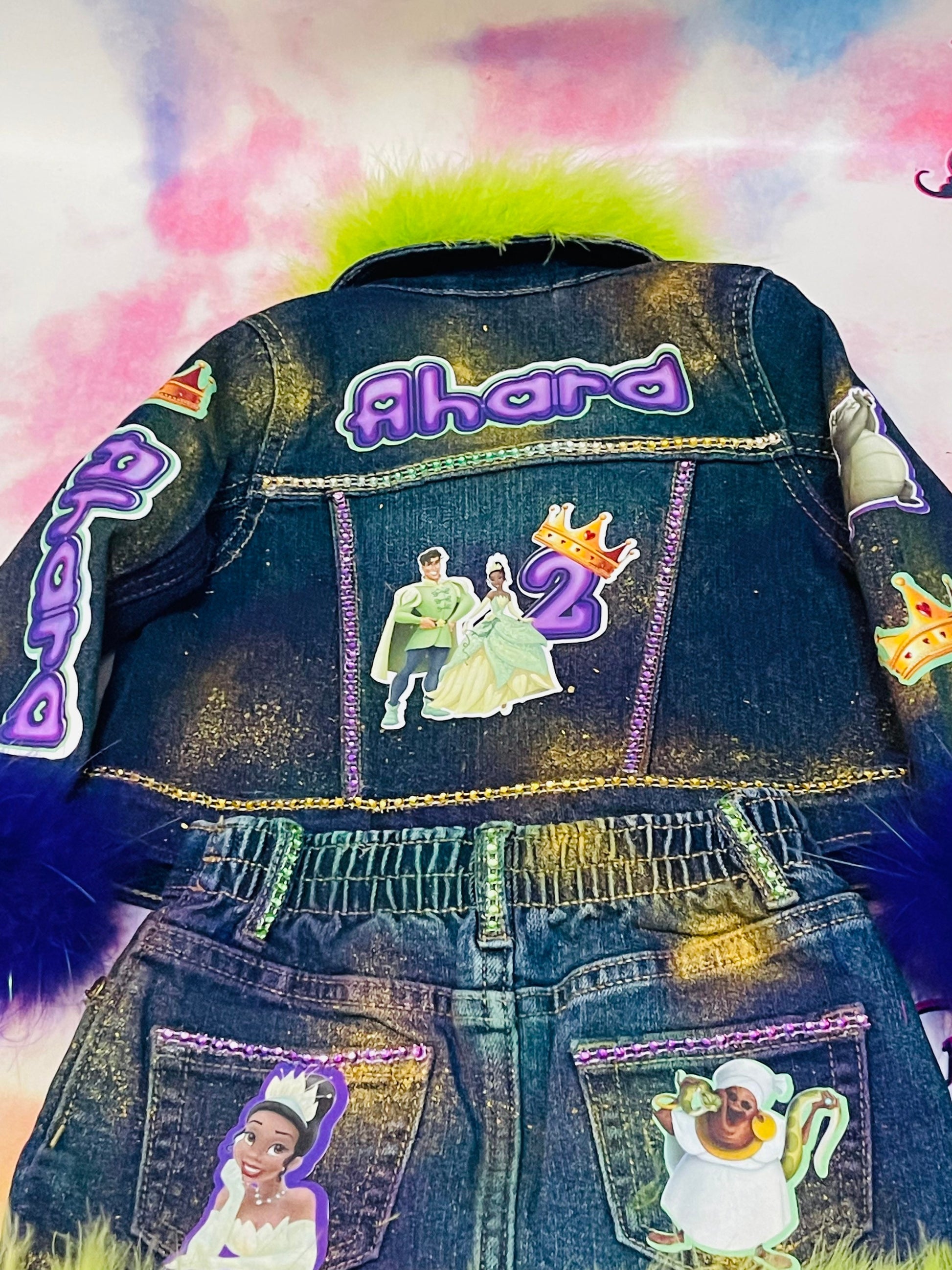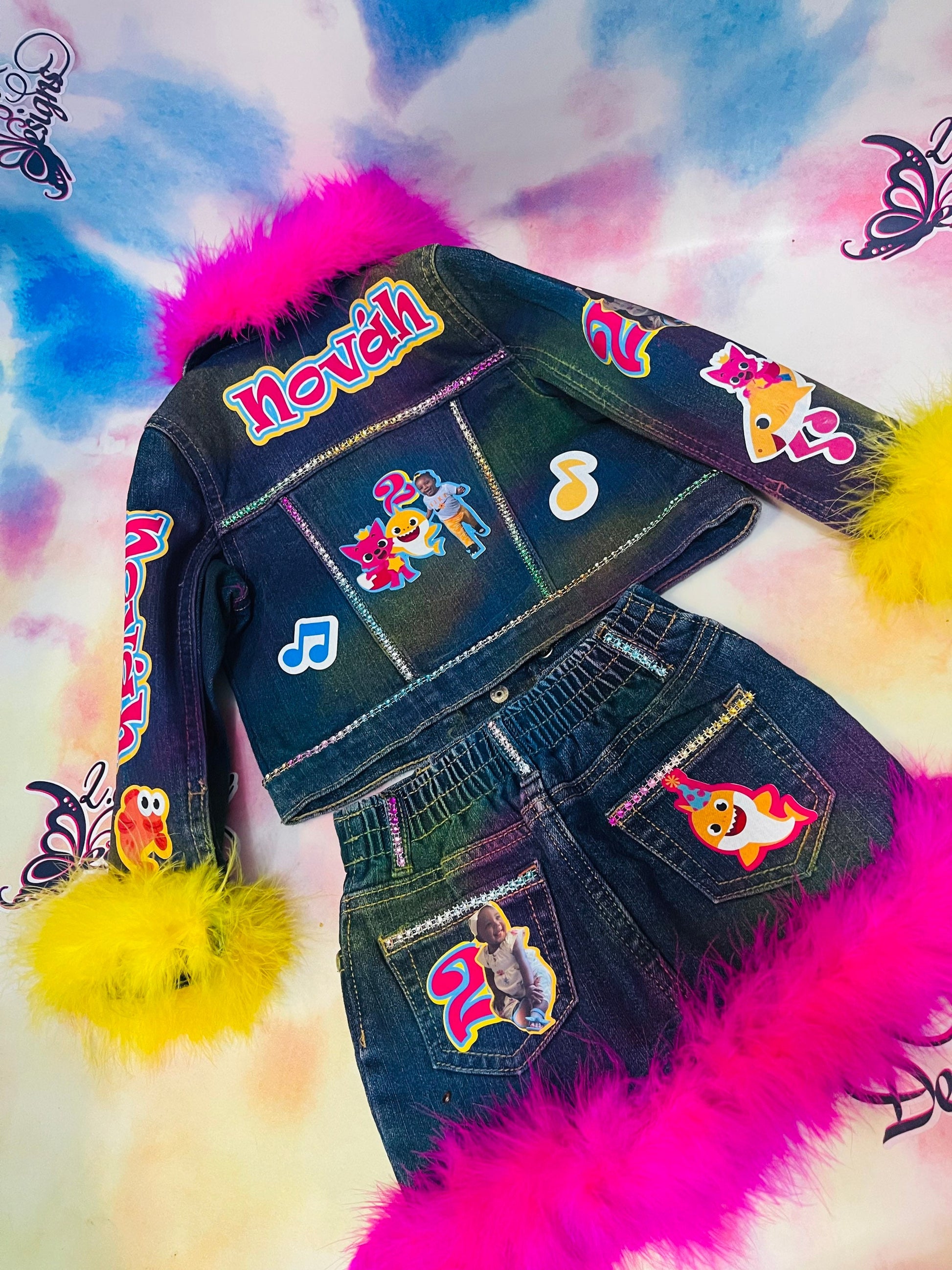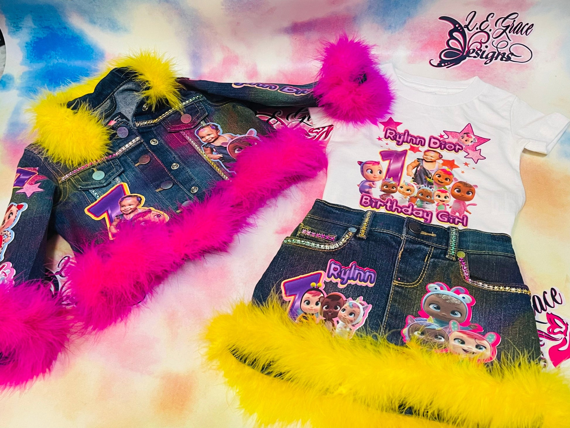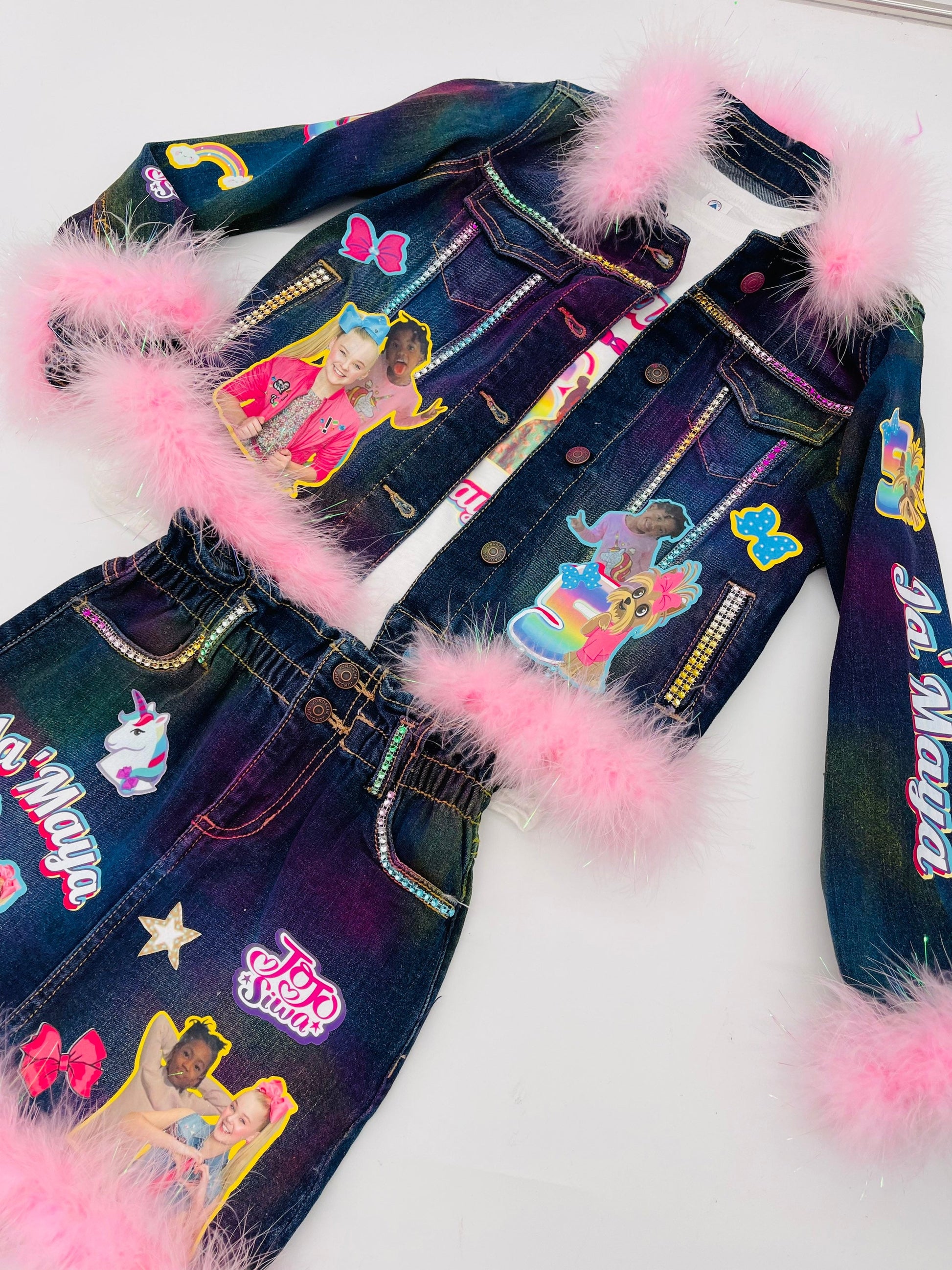 This set includes a denim Set including a shirt which will include your child’s name, age, and character. For girl sets you can add fur trim, etc. Please make sure to specify if you'd like fur / feather color.