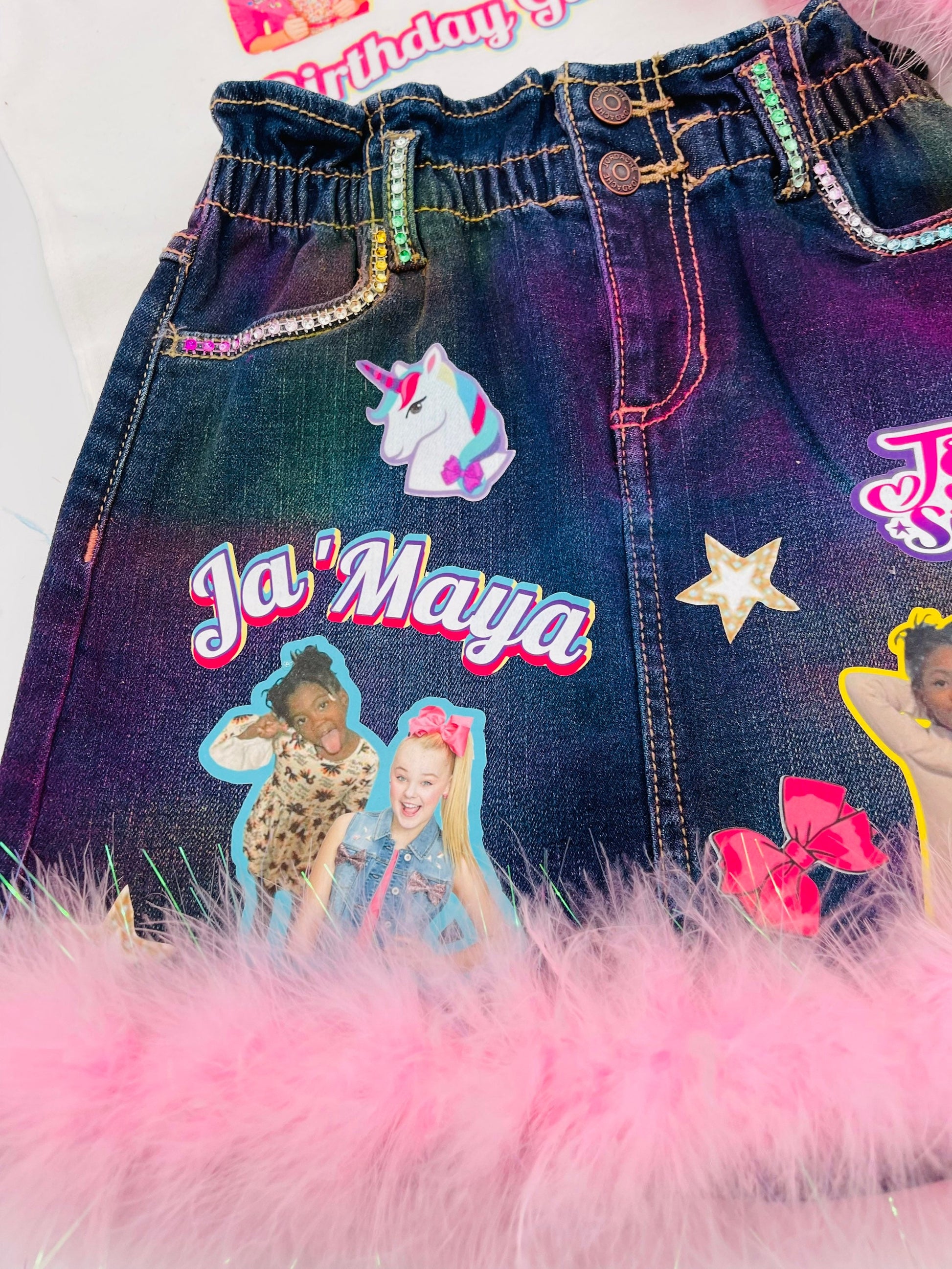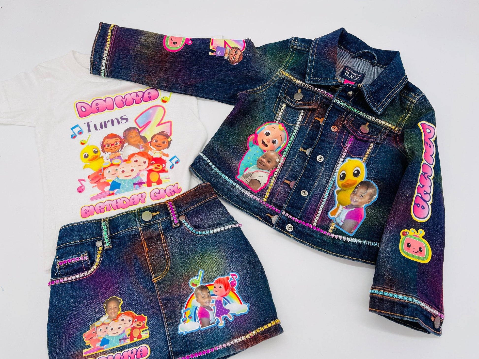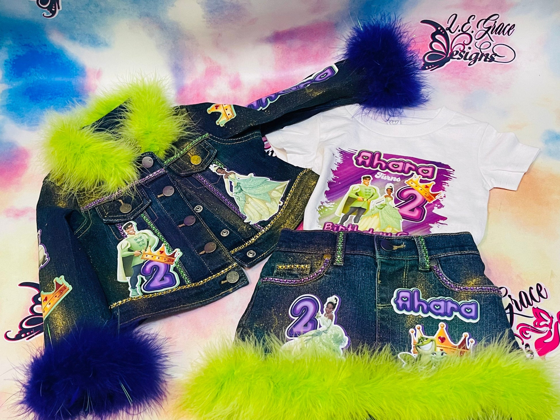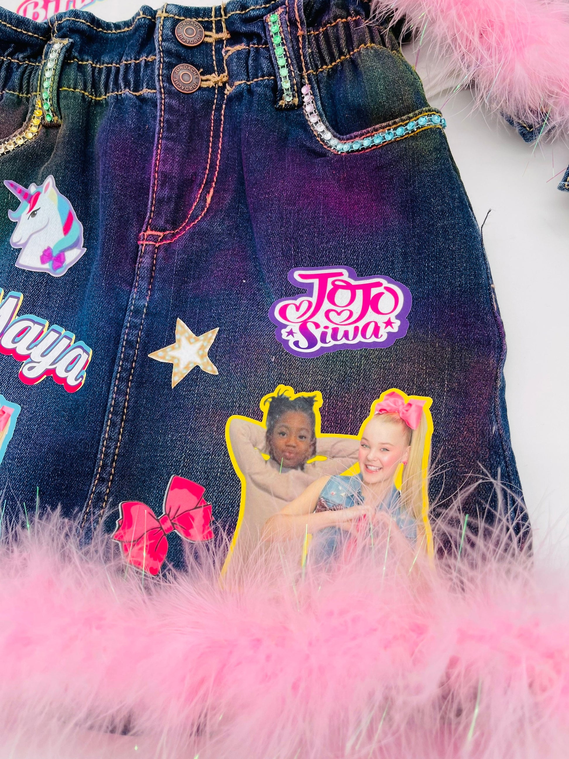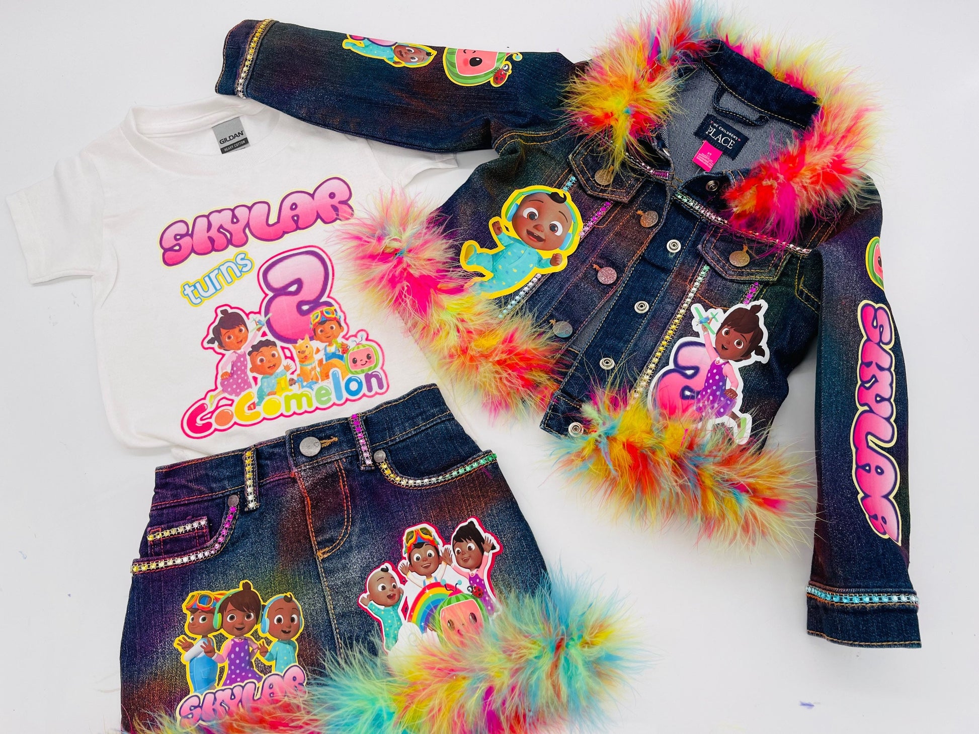 This set includes a denim Set including a shirt which will include your child’s name, age, and character. For girl sets you can add fur trim, etc. Please make sure to specify if you'd like fur / feather color.